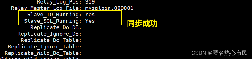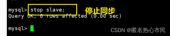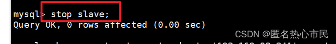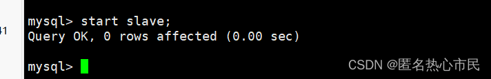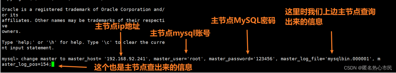 执行如下指令 :指定当前从库对应的主库的IP地址,用户名,密码,从哪个日志文件开始的那个位置开始同步推送日志。