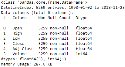 Our DataFrame contains 6 columns, with prices starting from the year 1998 to the present trading day. The column of interest is theadjusted closing prices. Suppose that we are interested in calculating the daily VaR of 2017; let's obtain this dataset using the following code: