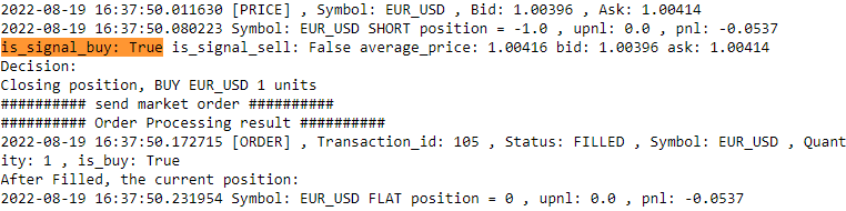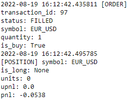trader.run()The first parameter, broker , is the same object created for our broker in the previous section. Again, we are resampling our time series prices at one-minuteintervals('60s'), and we are interested in trading the EUR/USD currency pair, entering into a position of at most one unit at any given time. With a mean_periods value of 5, we are interested in taking the most recent 5 resampled intervals in calculating the average price of the past five minutes as our short-term average price. With a long_mean_period of 10, we are interested in taking the most recent 10 resampled intervals in calculating the average price of the past 10 minutes as our long-term average price.