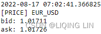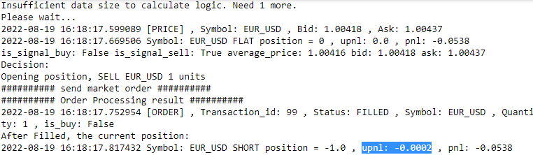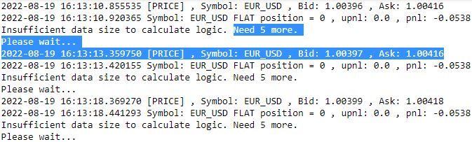 At the start of trading, we obtained the current market prices, staying in a flat position with neither profits nor losses. There is insufficient data available to make any trading decisions, and we will have to wait 10 minutes before we can see the calculated parameters take effect.https://www.oanda.com/demo-account/![]()