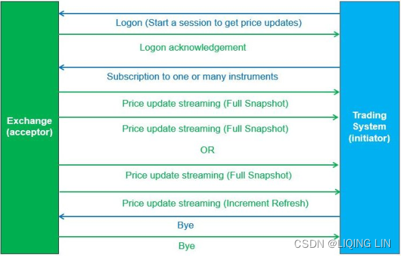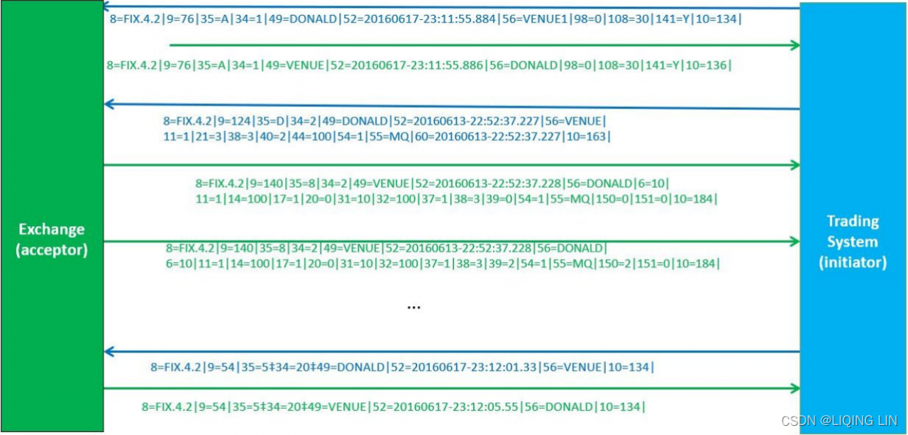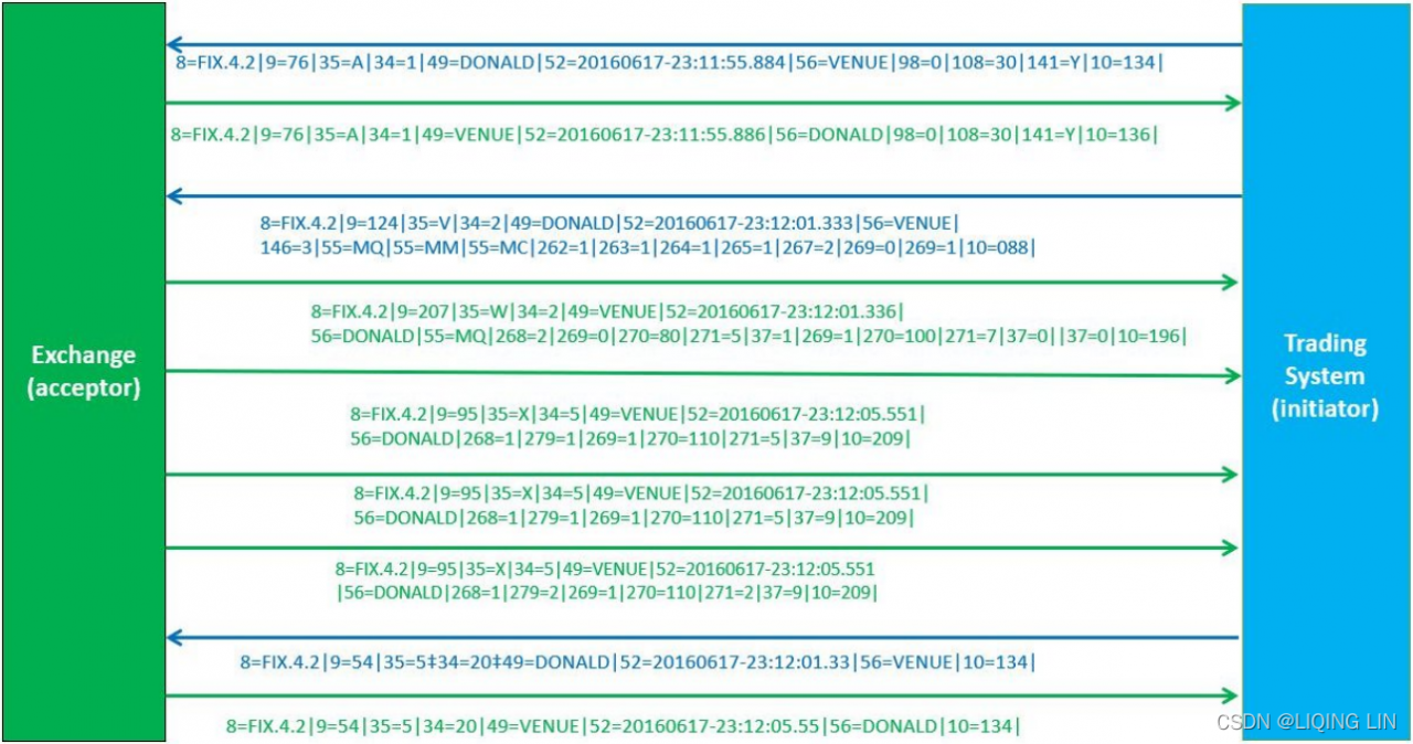 The following diagram describes the communication between the initiator发起者, which is the trading system, and the acceptor, which is the exchange: