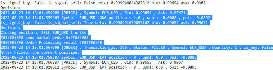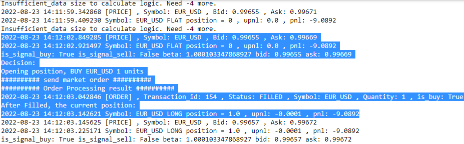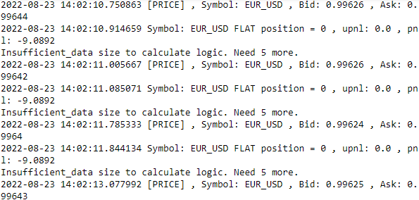 With our trading parameters set up, the run() method is called to start the trading system. We should see an output on the console that is similar to the following: