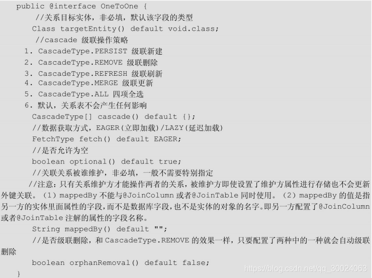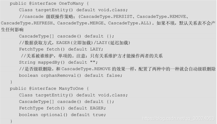 关联关系注解包括 @JoinColumn、@OneToOne、@OneToMany、 @ManyToOne、@ManyToMany、@JoinTable、@OrderBy。