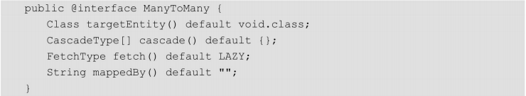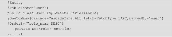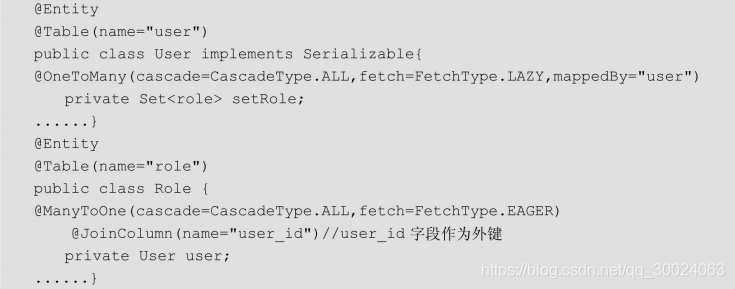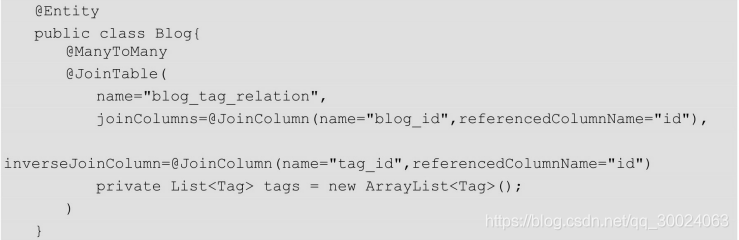 (2)假设Blog和Tag是多对多的关系,有一个关联关系表blog_tag_relation,表中有两个属性blog_id和tag_id,那么Blog实体里面的写法如下: