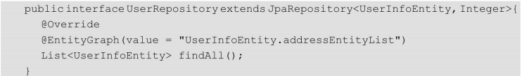 (2)只需要在查询方法上加@EntityGraph注解即可,其中value 就是@NamedEntityGraph中的Name。实例配置如下: