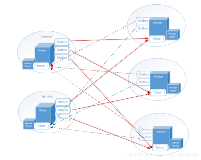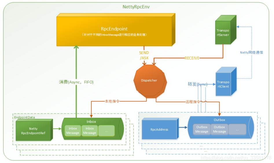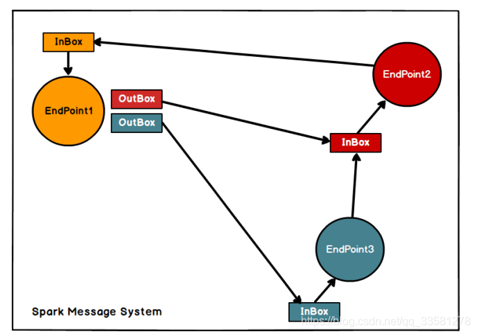 spark2以后使用Netty通讯框架作为内部通讯组件。Spark通讯框架中各个组件(Client/Master/Worker)可以认为是一个个独立的实体,各个实体之间通过消息来进行通信。Endpoint(Client/Master/Worker)有1个InBox和N个OutBox(N>=1,N取决于当前Endpoint与多少其他的Endpoint进行通信,一个与其通讯的其他Endpoint对应一个OutBox),Endpoint接收到的消息被写入InBox,发送出去的消息写入OutBox并被发送到其他Endpoint的InBox中。