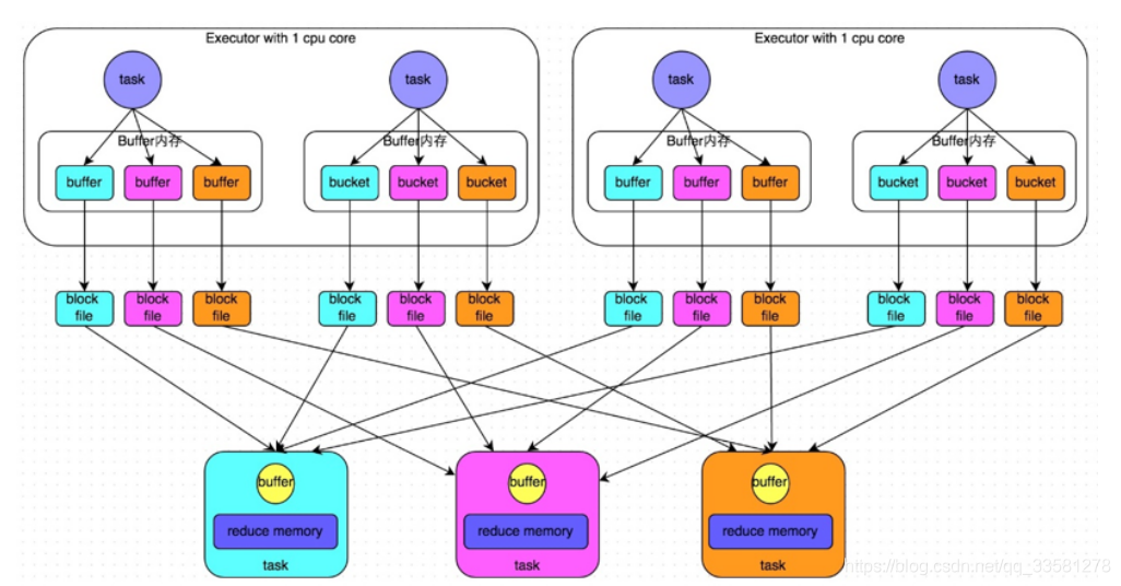 - 完成操作后,BlockTransforService去Executor0所在的节点拉数据,默认会启动五个子线程。每次拉取的数据量不能超过48M(reduce task每次最多拉取48M数据,将拉来的数据存储到Executor内存的20%内存中)