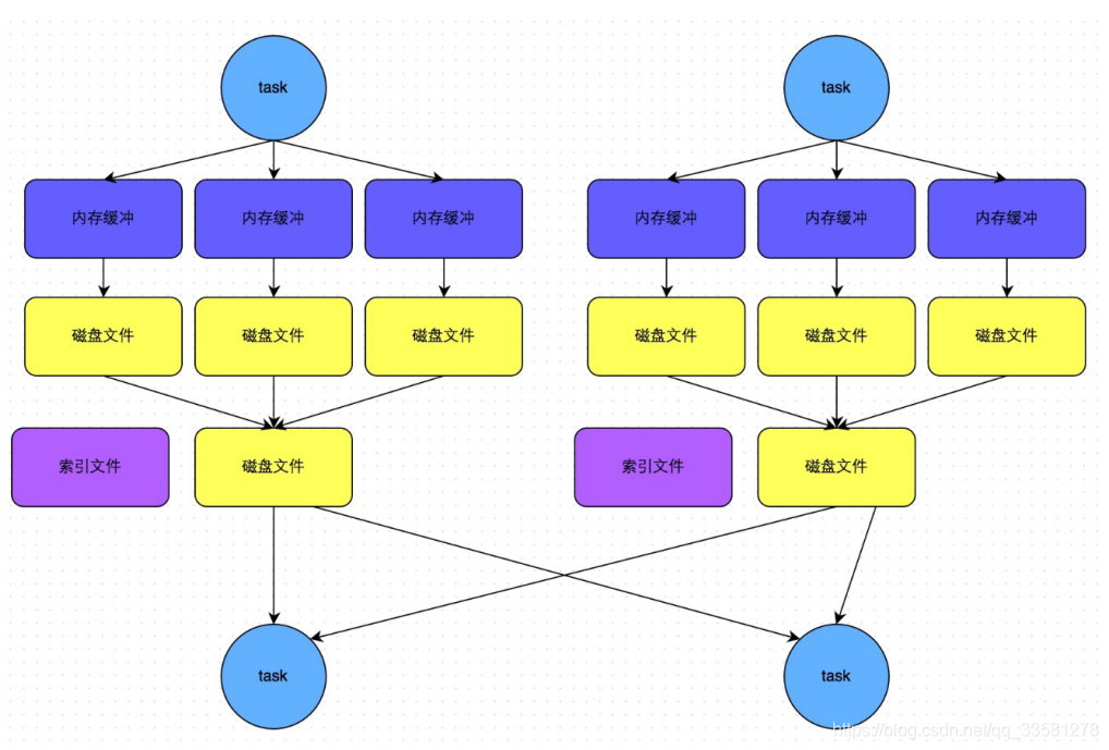 - map阶段结束后,计算状态和小文件封装到MapState对象,并交给MapOutPutTrackerWorke管理
