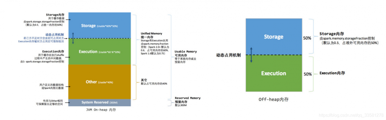 - 堆外内存:默认情况下堆外内存并不启用,可通过配置 spark.memory.offHeap.enabled 参数启用,并spark.memory.offHeap.size 参数设定堆外空间的大小