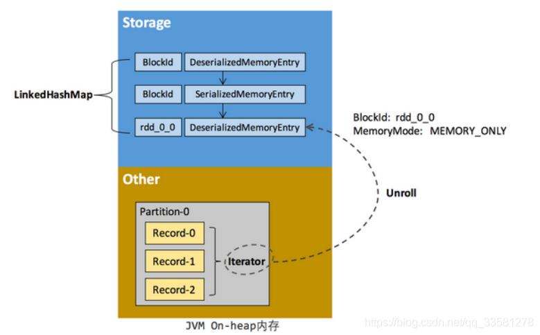 - RDD的缓存机制:RDD 在缓存到存储内存之前,Partition 中的数据一般以迭代器(Iterator)的数据结构来访问,同一 Partition 的不同 Record 的存储空间并不连续,将Partition由不连续的存储空间转换为连续存储空间的过程,Spark称之为"展开"(Unroll)