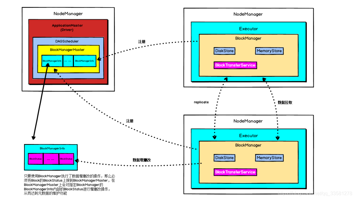 BlockManager:是整个Spark底层负责数据存储与管理的一个组件,Driver和Executor的所有数据都由对应的BlockManager进行管理。Driver上为BlockManagerMaster,Executor为BlockManager,类似主从的关系。