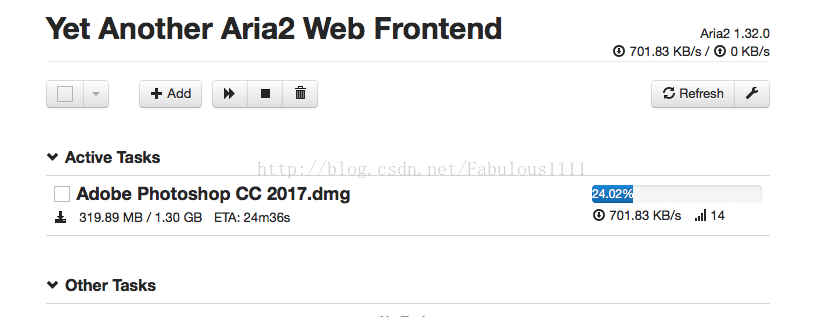 ③:随后返回第一步①中安装好的Aria2GUI,点击refresh,可发现任务已经在下载,速度取决于你的网速。