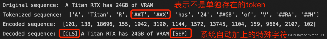 - 大写字母组成的单词会分解为一个或多个语义独立的token,但tokenizer也会用##来表示其并非单独存在。