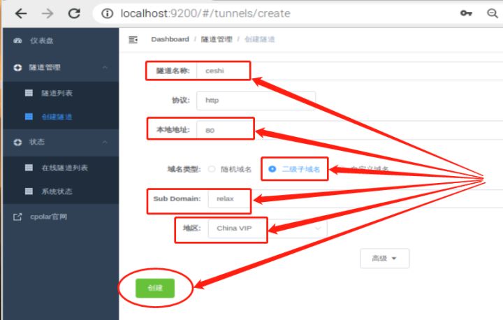 我们仍旧以之前在树莓派上创建的额网页信息为例,由于在树莓派上我们创建的网页以80端口输出(不论是relax网页,还是WordPress网站),因此我们在本地地址位置填入“80”;而隧道名称则是我们对这条隧道的标注,只要选择自己能够识别的内容即可,这里我们填入“ceshi”;接着,下一项的“Sub domain”就是指二级子域名,我们仍沿用relax为其二级子域名;地区我们在下拉菜单中选择“china VIP”。隧道相关信息填写完毕后,就可以点击下方的“创建”按钮,完成数据隧道的创建。