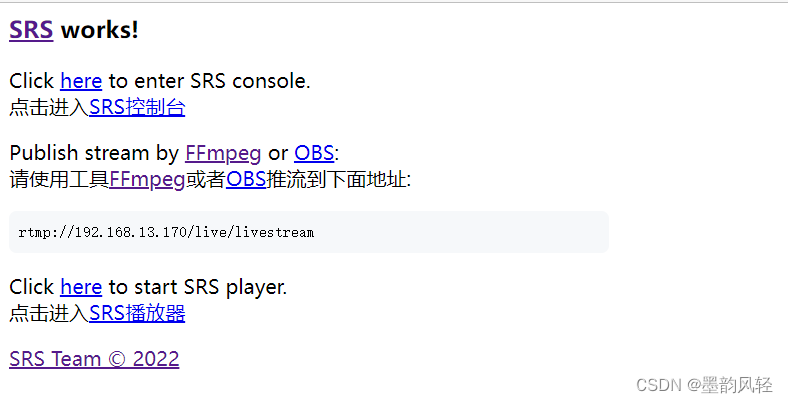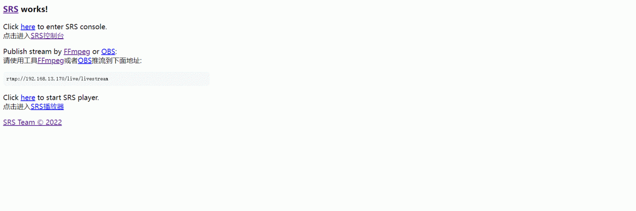 tail -n 30 -f ./objs/srs.log打开浏览器可以访问(我这个服务器的ip是192.168.13.170),有个控制台页面