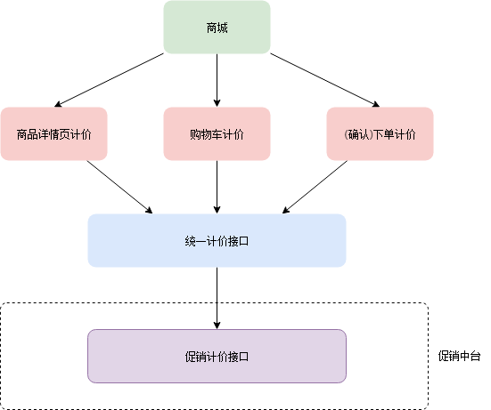 商城核心交易链路中商详页、购物车、下单这三块关于计价逻辑是分开独立维护的,没有统一,如下图所示。显然随着促销优惠的增加或者玩法的变动,商城侧业务重复开发量会显著加大。