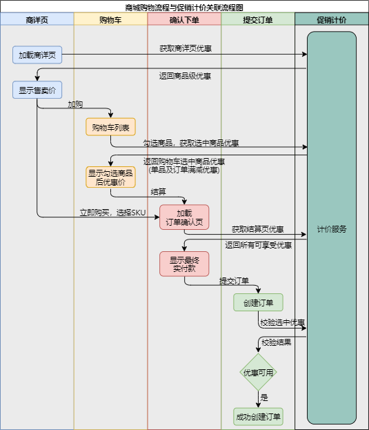 而随着促销系统独立,整个商城购物流程与促销系统的关系如下: