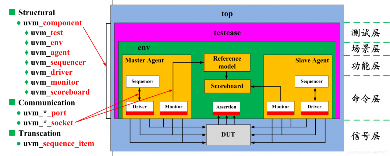 另:还有一个component比较重要reference model,UVM中并没有针对reference model定义一个类。所以通常来说,reference model都是直接派生自uvm_component。reference model的作用就是模仿DUT,完成与DUT相同的功能。DUT是用Verilog写成的时序电路,而reference model则可以直接使用SystemVerilog高级语言的特性,同时还可以通过DPI等接口调用其他语言来完成与DUT相同的功能。