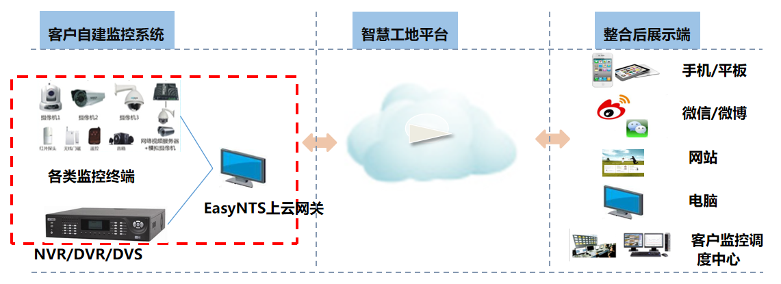 在智慧工地项目中通过在工地车辆出入口,塔吊,升降机等区域安装监控,通过EasyNTS上云网关,将视频传输到智慧工地平台,实现多终端观看。