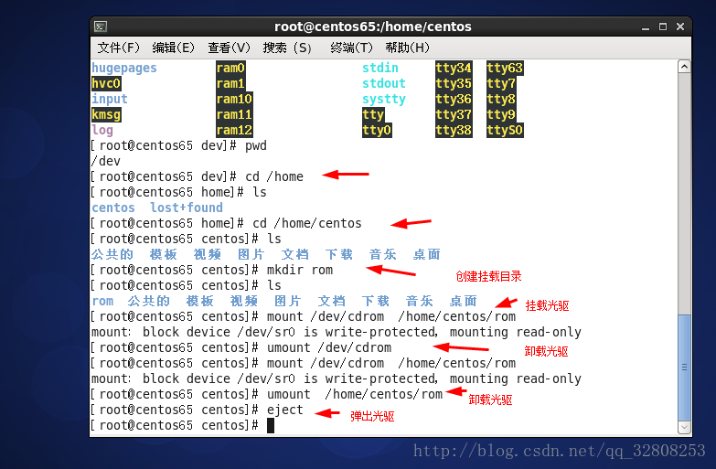 [root@centos65 centos]# mount /dev/cdrom /home/centos/rom