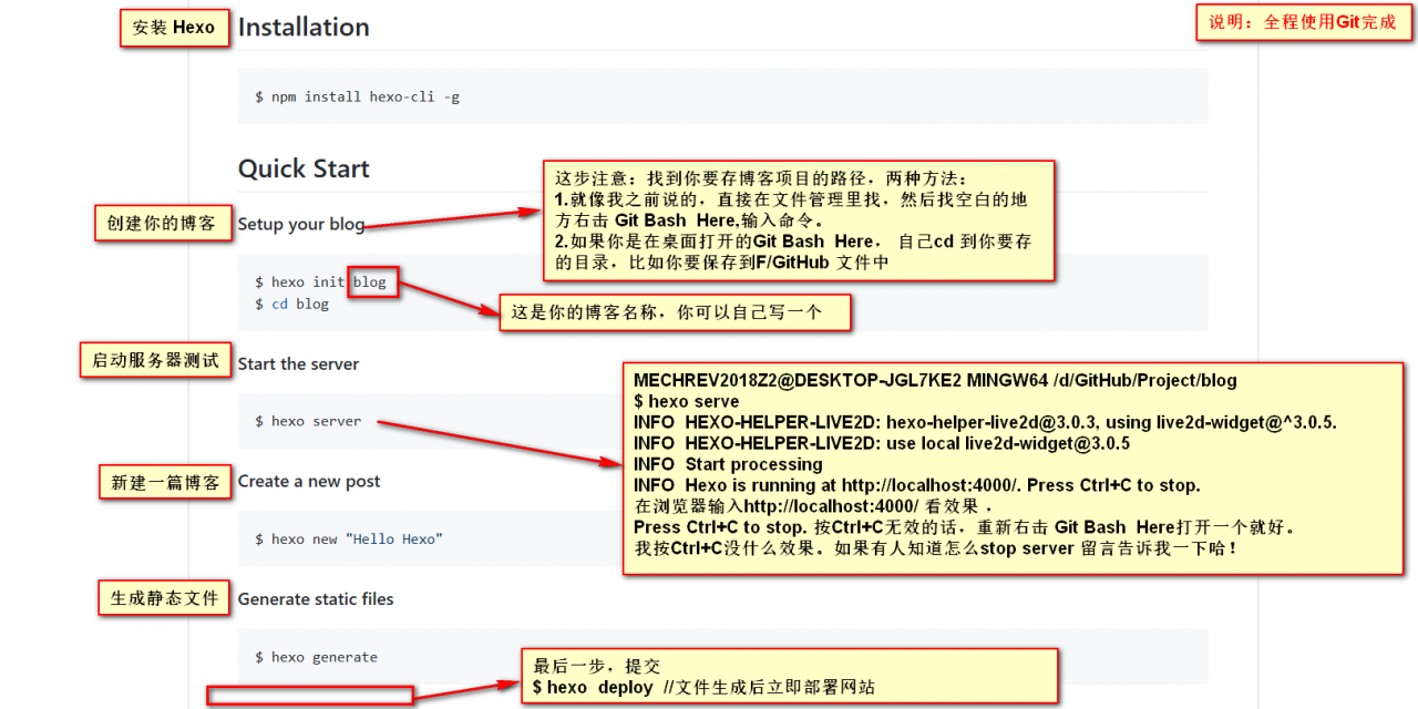 如何使用 Hexo ?GitHub 说的很清楚,我说一些需要注意的地方(踩坑过来的),就一张图片说完。强烈建议去看