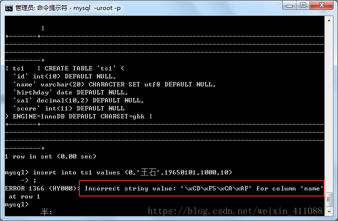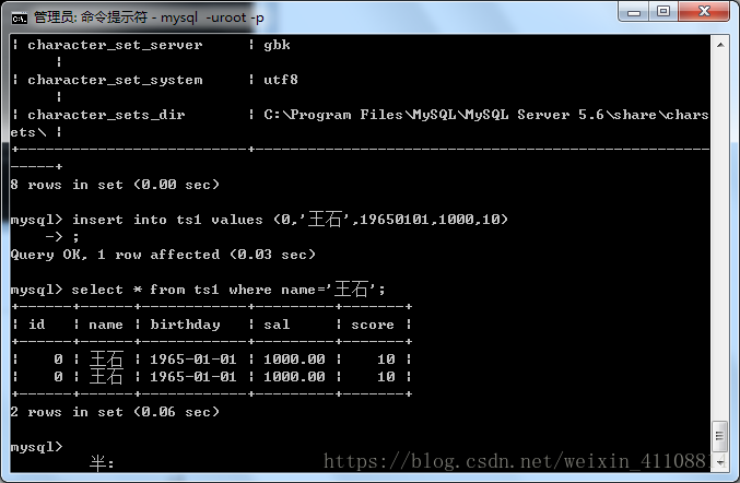 最近学习mysql数据库,安装了MySQL5.6,开始练习,在表格中插入中文字段时提示插入字符串非法。