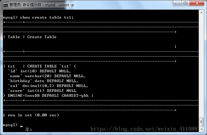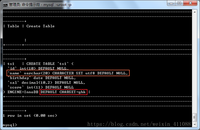 再用show create table ts1查看时name字段的字符集定义就消失了,因为他和表的字符集是统一的,就不用显示了。