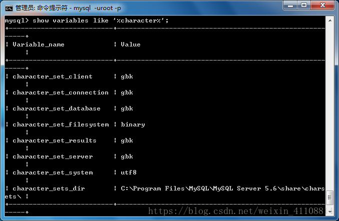 解决步骤(以win7下MySQL5.6为例,设置为gbk字符集)