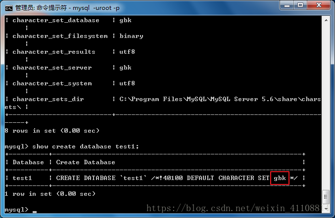 如果不是我们想要的,那就用:alter database test1 default character set gbk;改过来。
