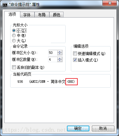 4、在以命令行运行的模式下(练习的时候通常是这样子),还有确定我们的操作系统采用的是什么字符集。在win7的cmd窗口,可以点击左上角的图标,在下拉框的属性菜单页,看到当前代码页,我的系统是用的GBK字符集,这点很重要,数据库系统使用的字符集全部要改为gbk,否则总是报错。