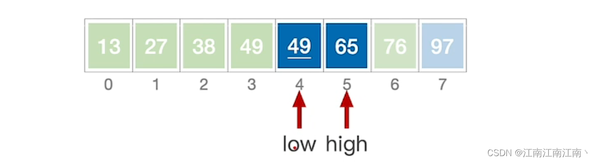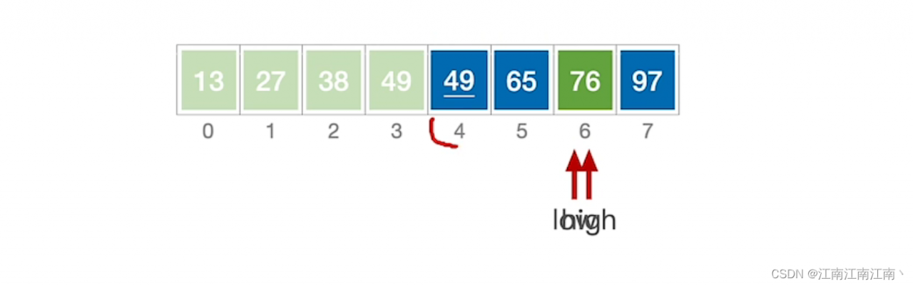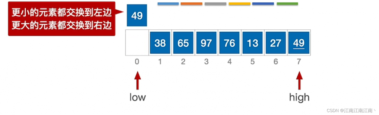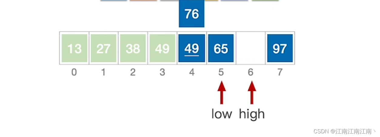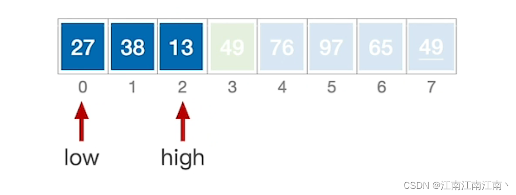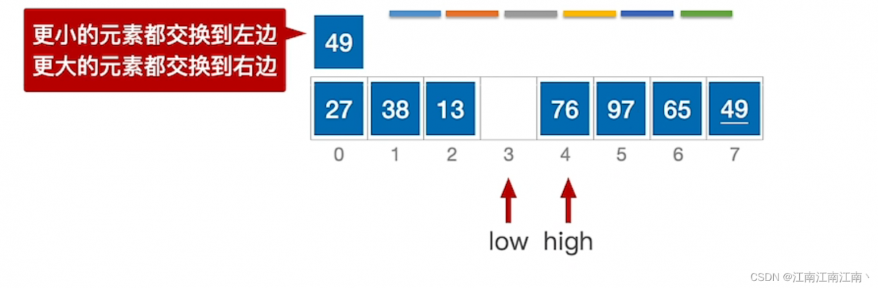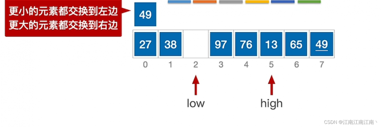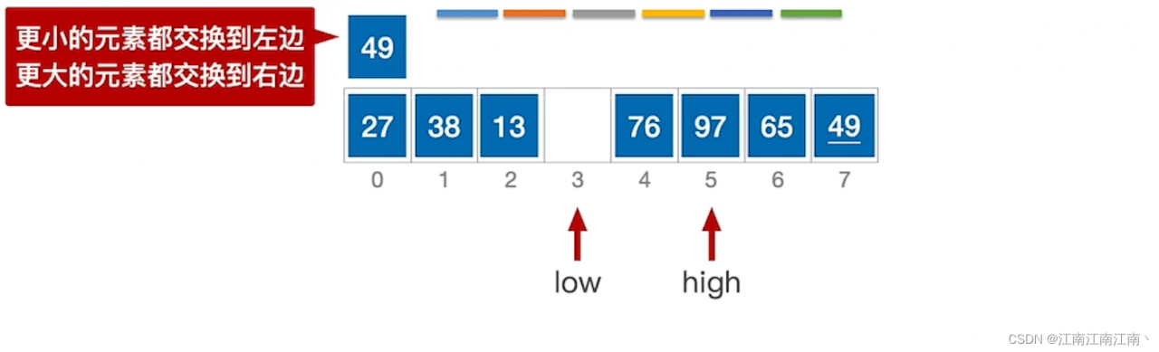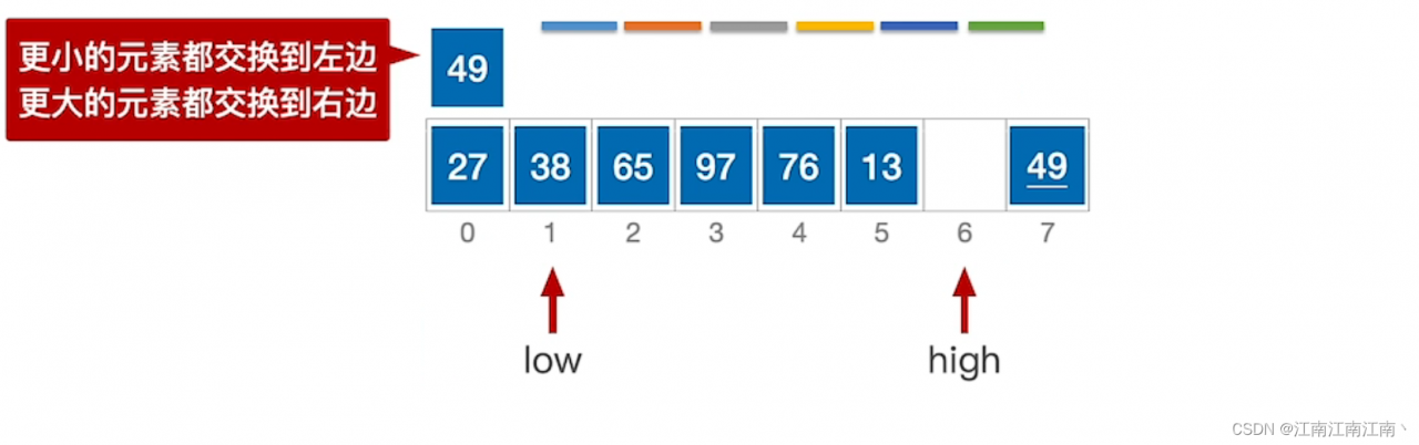 low指针的左边都小于基准元素,high指针的右边都大于等于基准元素