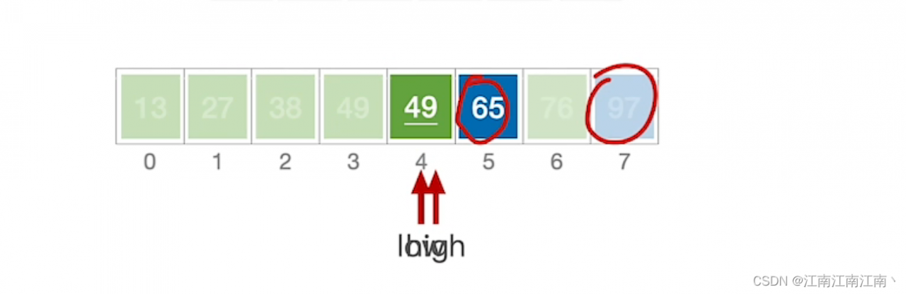 9.low指向元素97 > 49→97交换到high指针指向的位置,low空