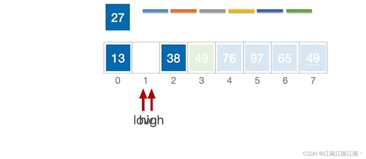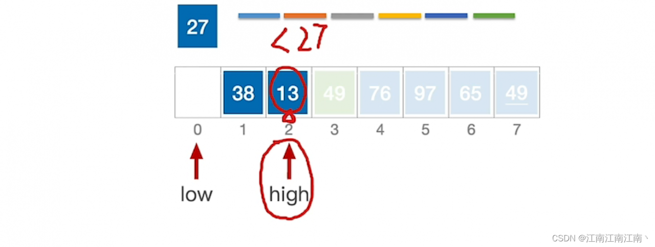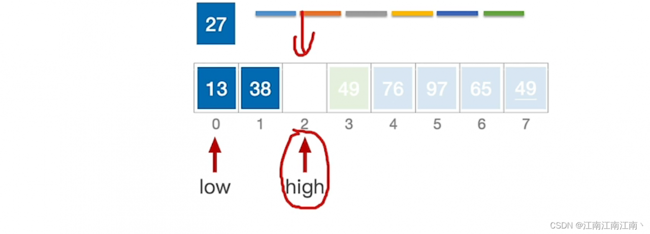 2.high当前指向元素27 < 49→27交换到low指针指向的位置,high空