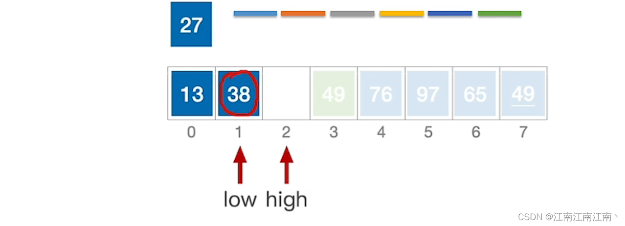 16.low指向元素为38 > 27→27交换到high指针指向的位置,low空