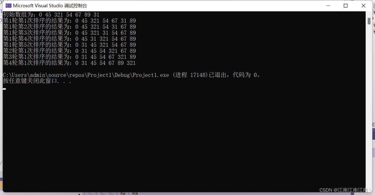 3.采取递归的思想,第一轮对0-7的元素冒泡,结束后0处是最小元素
