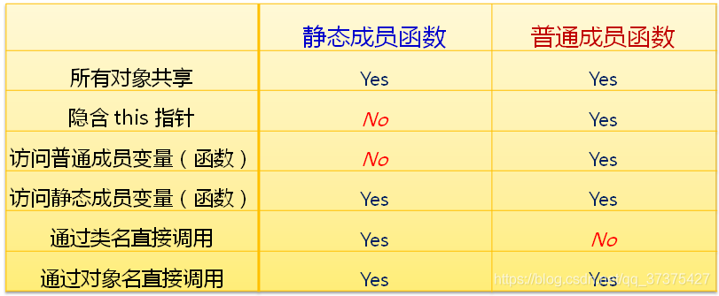 - 静态成员函数只能直接访问静态成员变量(函数),而不能直接访问普通成员变量(函数)