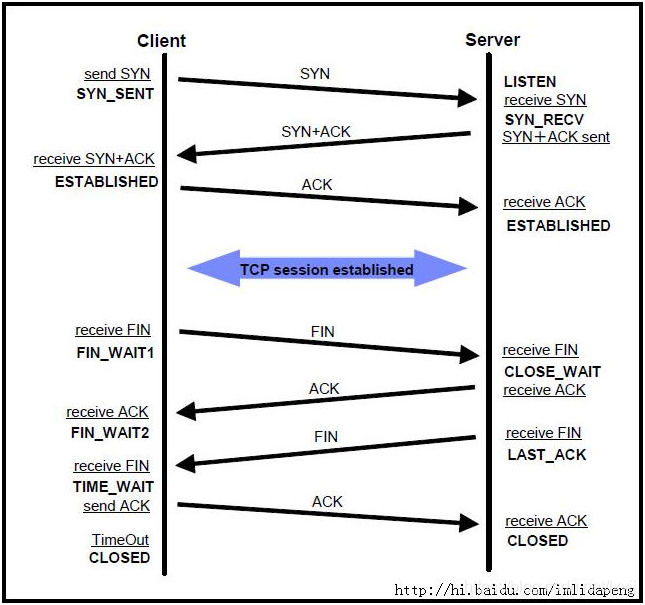 四次挥手:1、A首先向B发送一个FIN消息,进入FIN_WAIT1状态,A不再向socket中写数据。2、B收到该FIN消息后,向A发送确认消息,A在收到该确认消息后进入FIN_WAIT2状态,即等待B读完数据后关闭,B根据FIN的Sequence number可以知道自己是否已经读完了A的所有数据,B在读完A的所有数据前处于CLOSE_WAIT状态。3、B在读完A的所有数据后,向A发送FIN消息,进入LAST_ACK状态,即B不再写也不再读,只是等待最后一个确认关闭的ack。4、A在收到B的FIN后,发送ack消息,之后进入TIME_WAIT状态,timeout后释放socket。5、B收到A发送的lask ack后同样进入后释放socket。