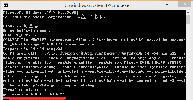 8. 测试MinGW是否安装成功。Win+R,运行cmd命令行,在cmd窗口中执行g++ -v,如下显示即为成功;