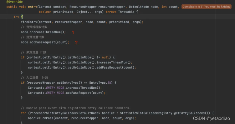 StatisticSlot 是限流的基石基本上后续限流所依赖的数据都在这里统计,下面我们只展开了 我们标红的两个计数,是因为下面的其他计数只是选取的计数node不同地层原理是一致的。