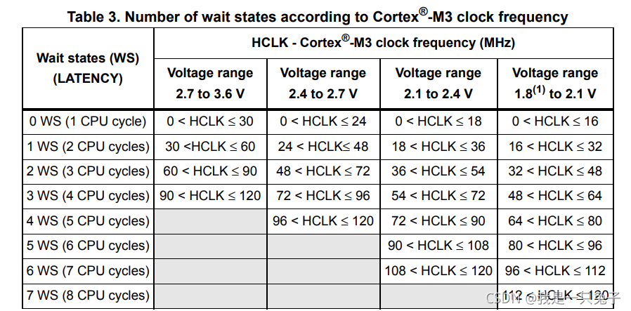现在的问题就是要找到程序死在哪里且解决掉这个程序BUG。通过观察代码,发现有几处while函数很值得怀疑,于是写了测试代码发现死在了硬件错误中断(HardFault_Handle)这里。在网上查找相关资料后发现大多数是说:数组越界或者堆栈溢出的问题。于是先在线仿真查看是执行哪条语句导致进入到HardFault_Handle(网上有很多方法去寻找这条语句,这就不列举了),找到后发现是与结构体成员判断语句有关,初步怀疑与地址没有四字节对齐有关,查看.MAP文件发现都对齐,应该不存在这样的问题。进一步查看汇编发现出问题的语句上一、二条都有PC指针进行偏移的操作,怀疑是这个指针进行偏移的时候出问题的,而PC指针指向的是Flash的地址,那么会不会是进行Flash读取出问题。再将底层的Flash以及时钟配置看了下,发现Flash的等待周期没有按照数据手册(如下图)进行正确配置。最后更正配置且进行测试,再无复现问题,就此解决。