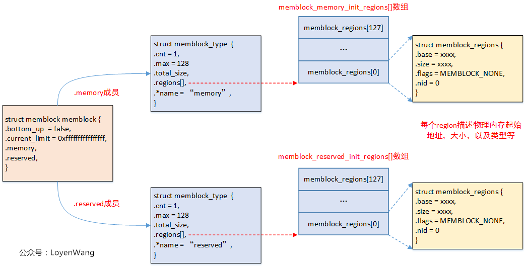 struct memblock定义了一个全局变量,用来维护所有的物理内存;struct memblock_type代表系统中的内存类型,包括实际使用的内存和保留的内存;struct memblock_region用来描述具体的内存区域,包含在struct memblock_type中的regions数组中,最多可以存放128个。