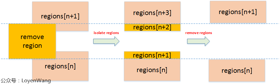 假如现在需要移除掉一片区域,而该区域跨越了多个region,则会先调用memblock_isolate_range来对这片区域进行切分,最后再调用memblock_remove_region对区域范围内的region进行移除操作。