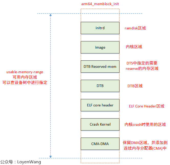 当物理内存都添加进系统之后,arm64_memblock_init会对整个物理内存进行整理,主要的工作就是将一些特殊的区域添加进reserved内存中。函数执行完后,如下图所示: