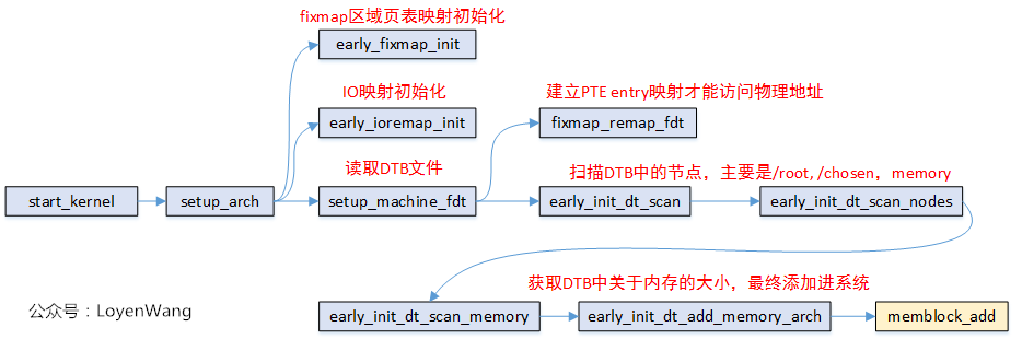 上文讲的内容都只是铺垫,为了能正确访问DTB文件并且解析得到物理地址信息。从入口到最终添加的调用过程如下图: