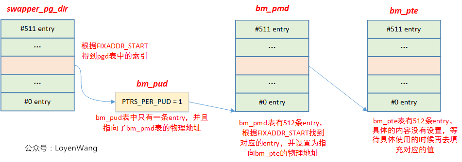 bm_pud/bm_pmd/bm_pte是三个全局数组,相当于是中间的页表,存放各级页表的entry,定义如下: