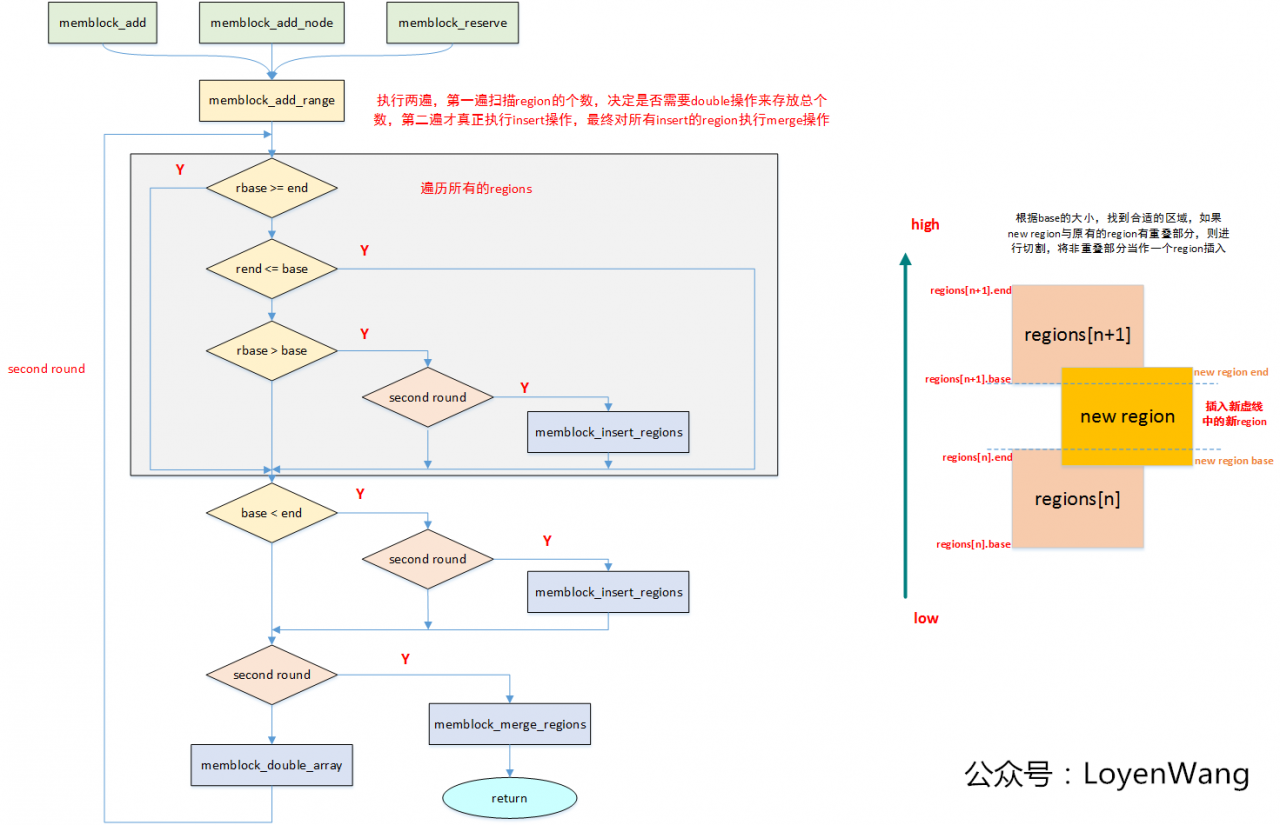图中的左侧是函数的执行流程图,执行效果是右侧部分。右侧部分画的是一个典型的情况,实际的情况可能有多种,但是核心的逻辑都是对插入的region进行判断,如果出现了物理地址范围重叠的部分,那就进行split操作,最终对具有相同flag的region进行merge操作。