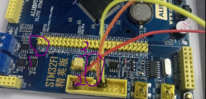 前面三根线和之前跑马灯的线连接是一样的,因为我们需要运用到led1灯,后面橙色的线连接RXD连接第二图的3位置PA10(TXD),