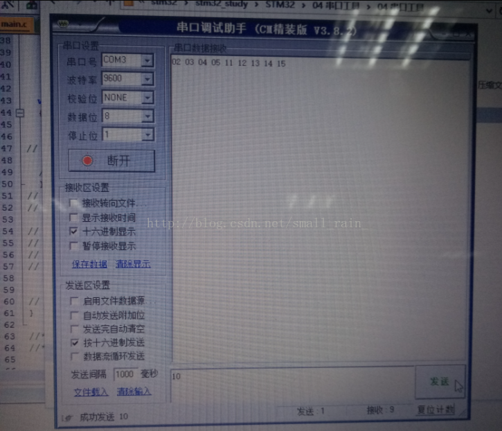 我往下面窗口输入10之后,按发送,它最左下角出现发送成功,说明串口已经接收数据,最后再继续按按键时,计数就从10开始往后