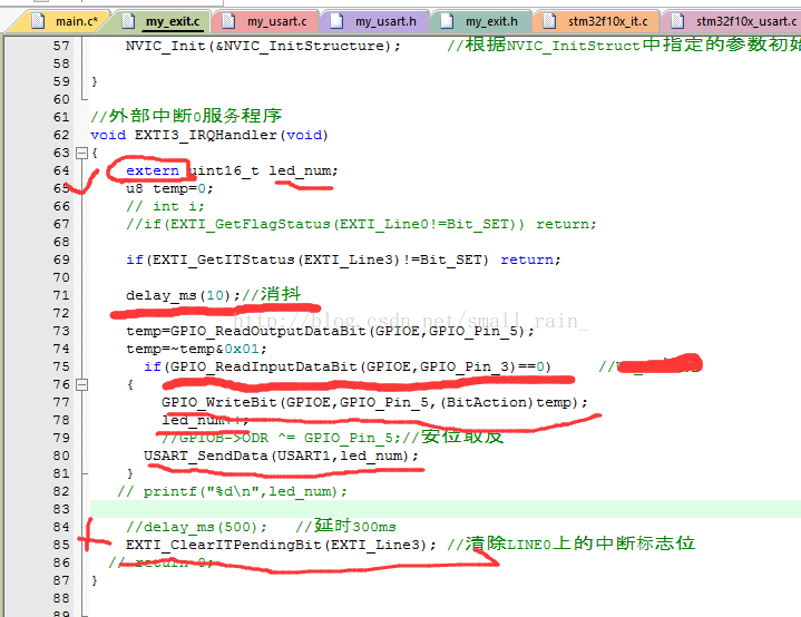 画线的为关键的语句,实现检测GPIOE3是否按下,以及LED1的反置,计数值的增加,最为重要的是需要清除中断标志位,不然会进入中断循环