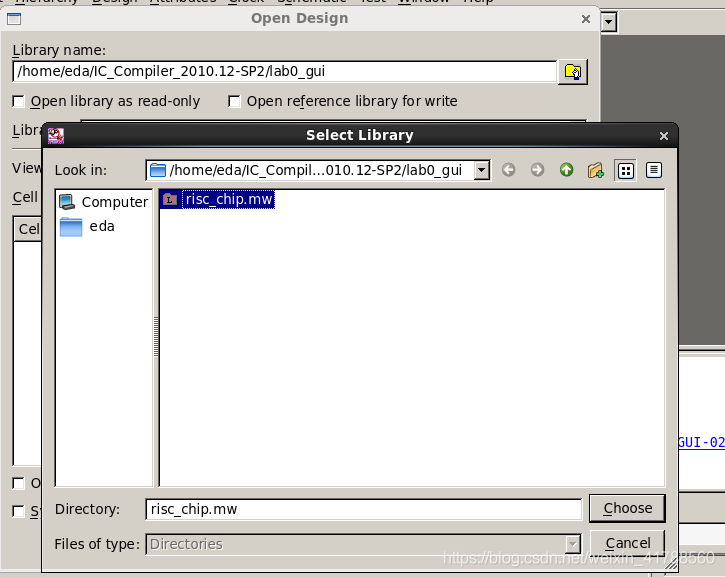 (b)“open design”里点击黄色文件夹图标,打开“Select Library”对话框。MilkyWay libraries有一个橙色的“L”图标,选择库文件夹risc_chip.mw,然后点击choose